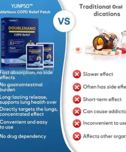 The YUNPSO™ DoubleNano COPD Relief Patch utilizes innovative natural therapy, with a focus on powerful ingredients like nano-quercetin and resveratrol. When applied, the patch’s advanced transdermal technology allows the active ingredients to penetrate deeply, providing immediate relief. It enhances blood circulation in the lungs, clears mucus and toxins, and helps open the airways, effectively supporting lung health and improving overall respiratory function.