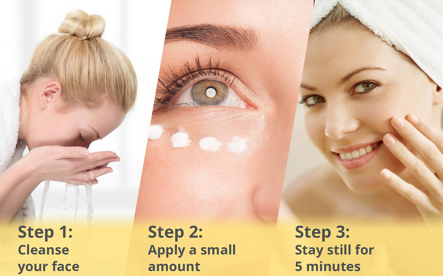 Dispense a tiny dot of the eye firmer and dab under and around the eyes.